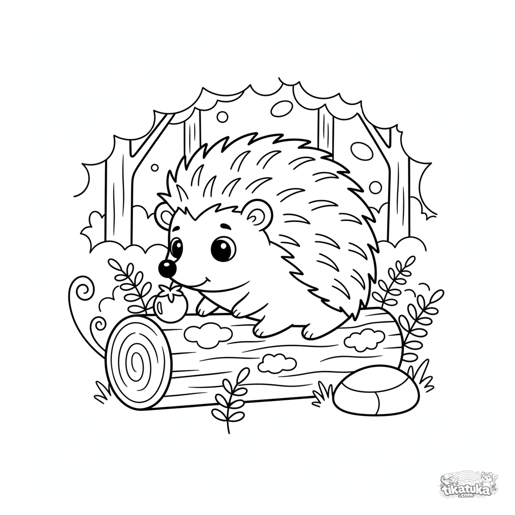 Раскраска с милым ёжиком на замшелом бревне. Для детей 5-7 лет. Изображён любопытный ёжик, изучающий ягодку в лесной полянке.