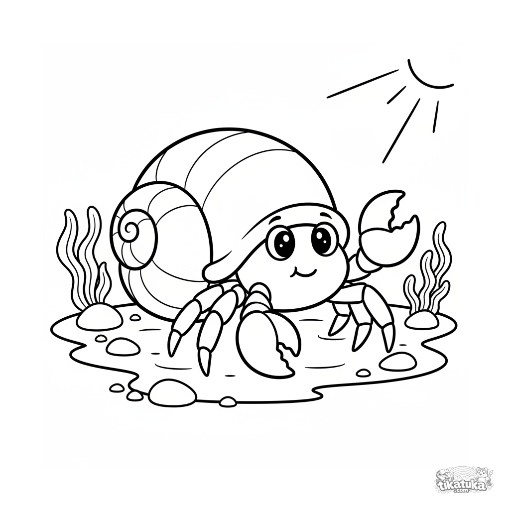 Раскраска для детей 4-6 лет: краб-отшельник исследует солнечную лужу на мелководье. Милая история в стиле книжной иллюстрации с простыми формами.