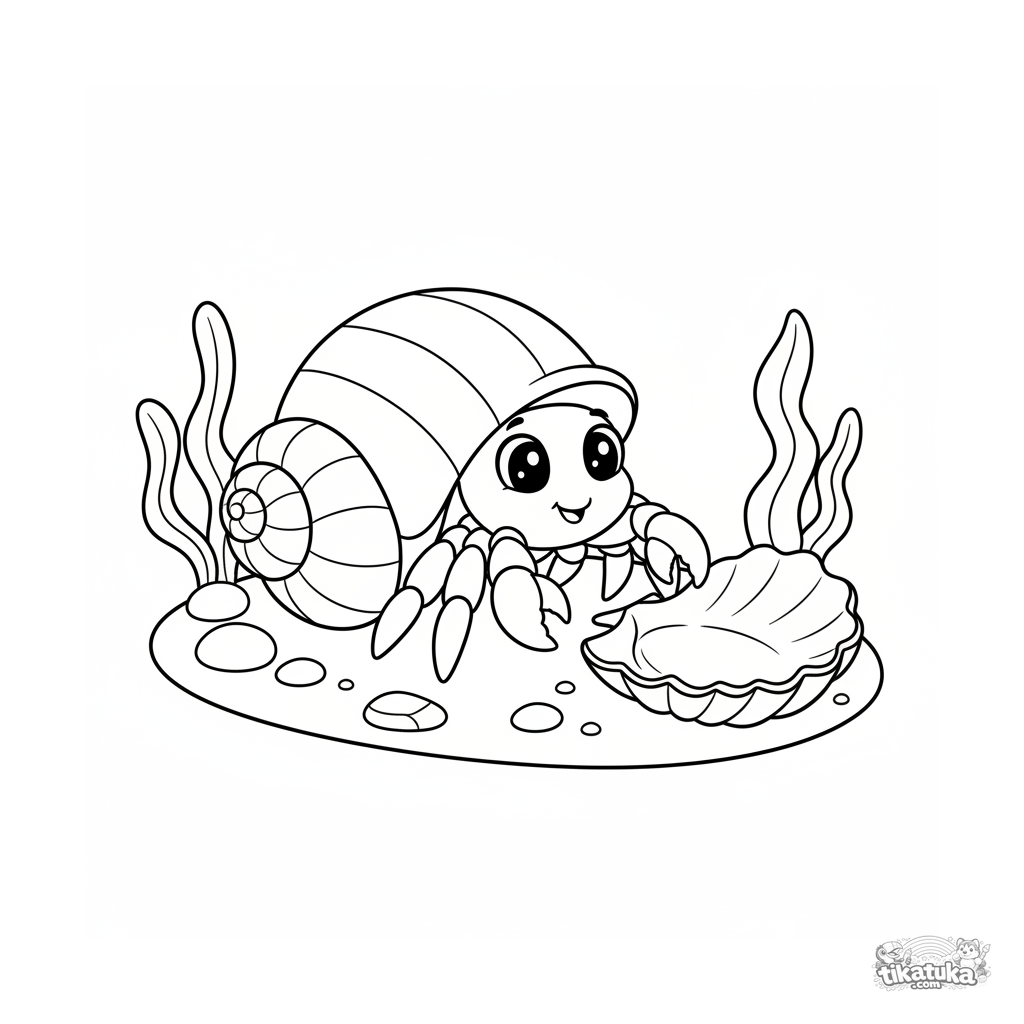 Раскраска с любопытным крабом-отшельником, выбирающим новый домик-ракушку в солнечной лужице на мелководье. Для детей 4-6 лет. Простые формы, милое выражение.