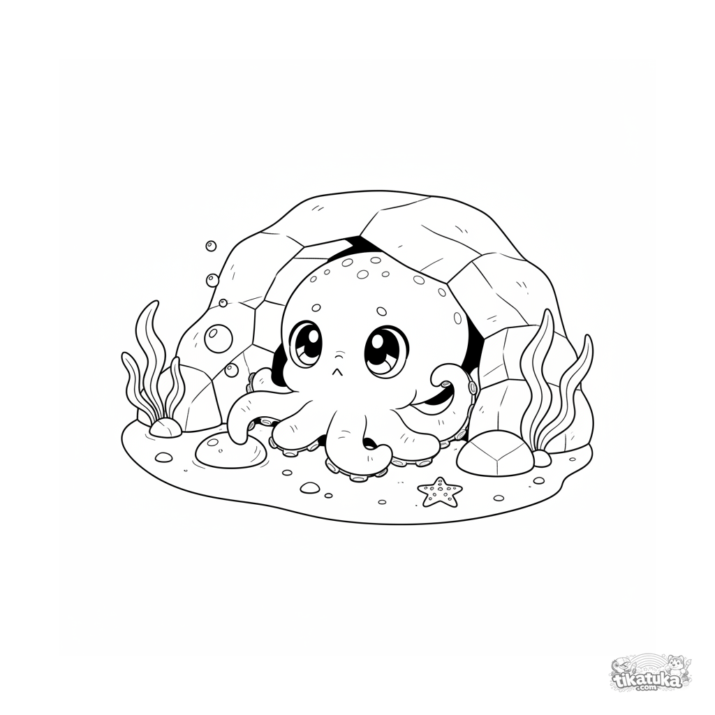 Раскраска для детей 7-9 лет: любопытный осьминог выглядывает из расщелины в скале, освещенной солнцем. Выразительная сцена с умеренной детализацией.
