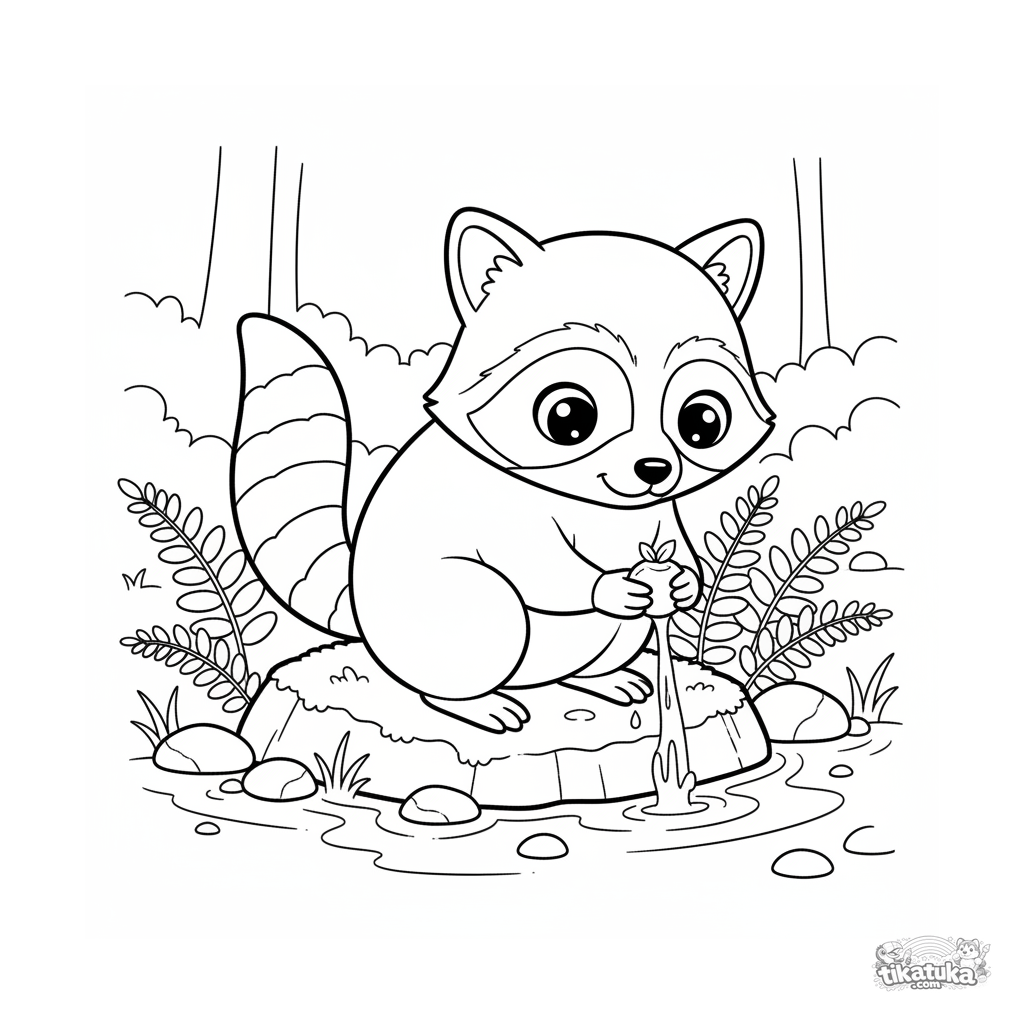 Раскраска для детей 4-6 лет: любопытный енот моет ягоду на берегу прозрачного ручья. Милая сценка с камнями и папоротниками.