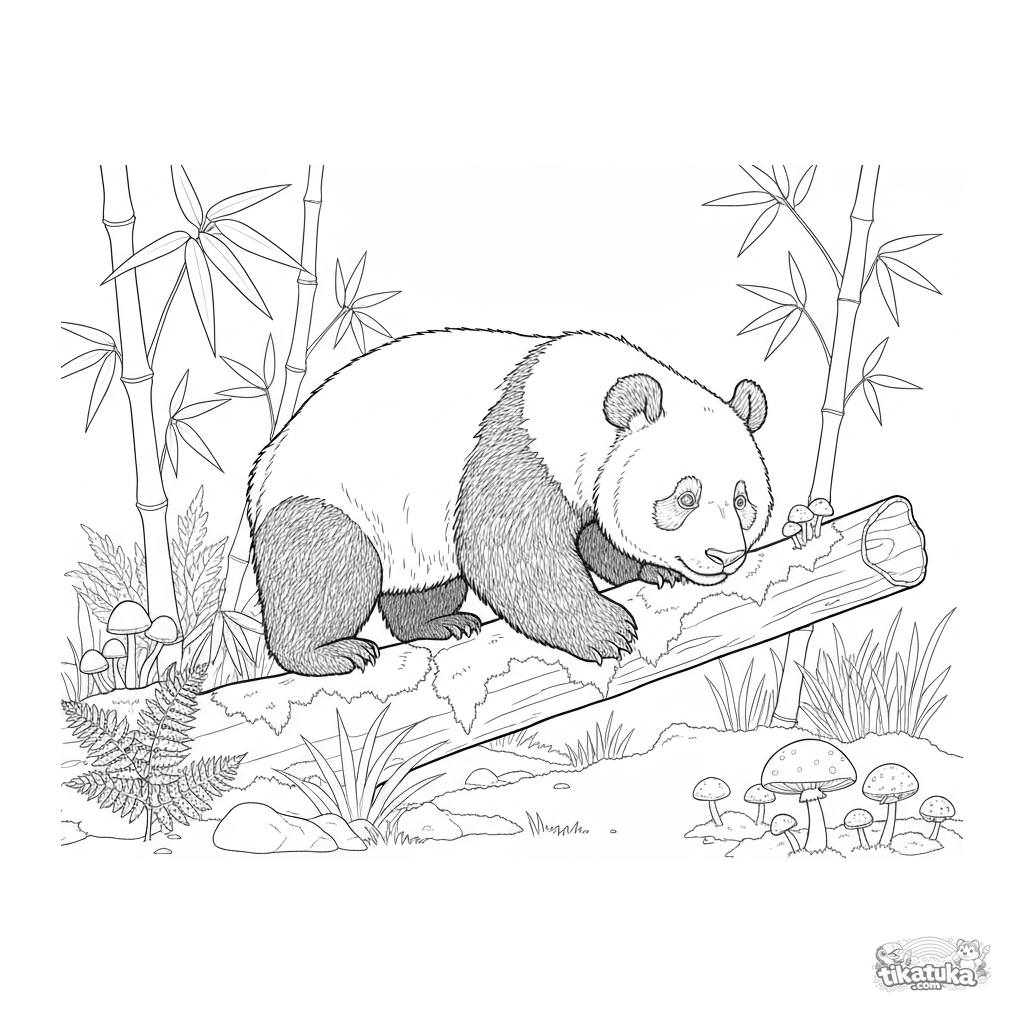 Раскраска с любопытной малой пандой для детей 6-9 лет. Панда балансирует на замшелом бревне в бамбуковом лесу, обнюхивает грибы.