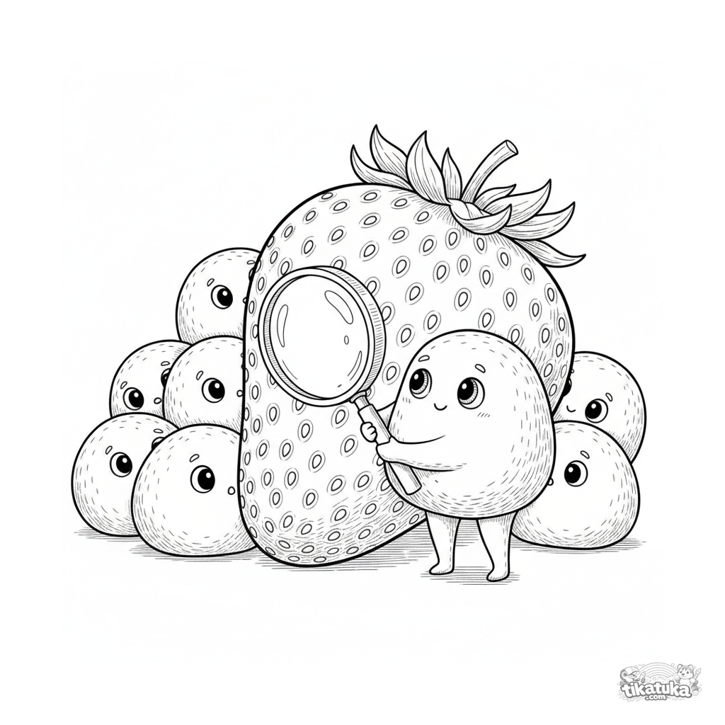 Детализированная раскраска в стиле старинной гравюры: моти с лупой изучает гигантскую клубнику. Для детей 10-12 лет, интересующихся наукой.