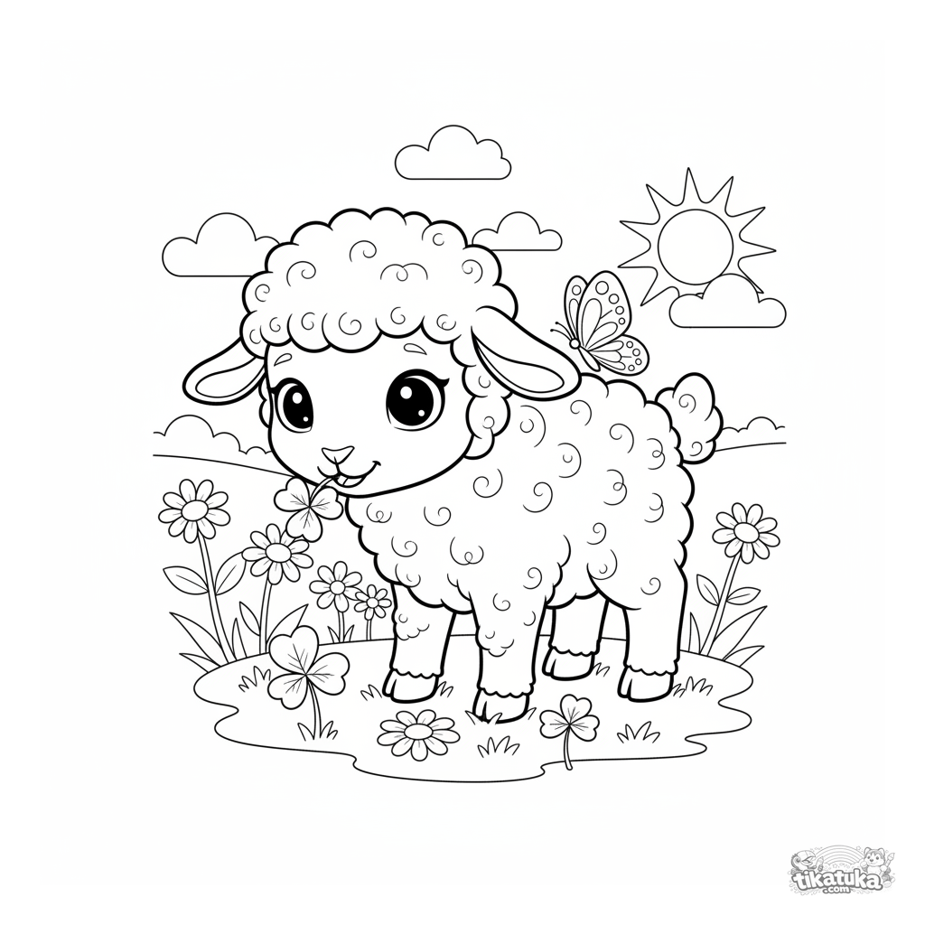 Раскраска с кудрявым ягнёнком на весеннем лугу. Для детей 4-6 лет. Ягнёнок щиплет клевер, на его спине сидит бабочка. Простые формы и милая сцена.
