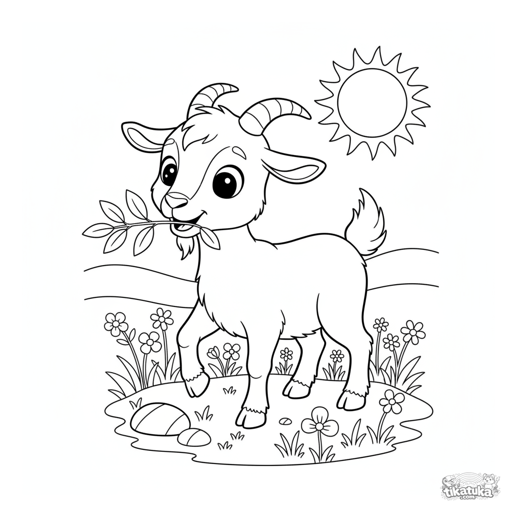 Раскраска с козлёнком для детей 4-6 лет. Весёлый козлёнок с кудрявыми рожками грызёт ветку на солнечном лугу. Простые формы и милый сюжет.