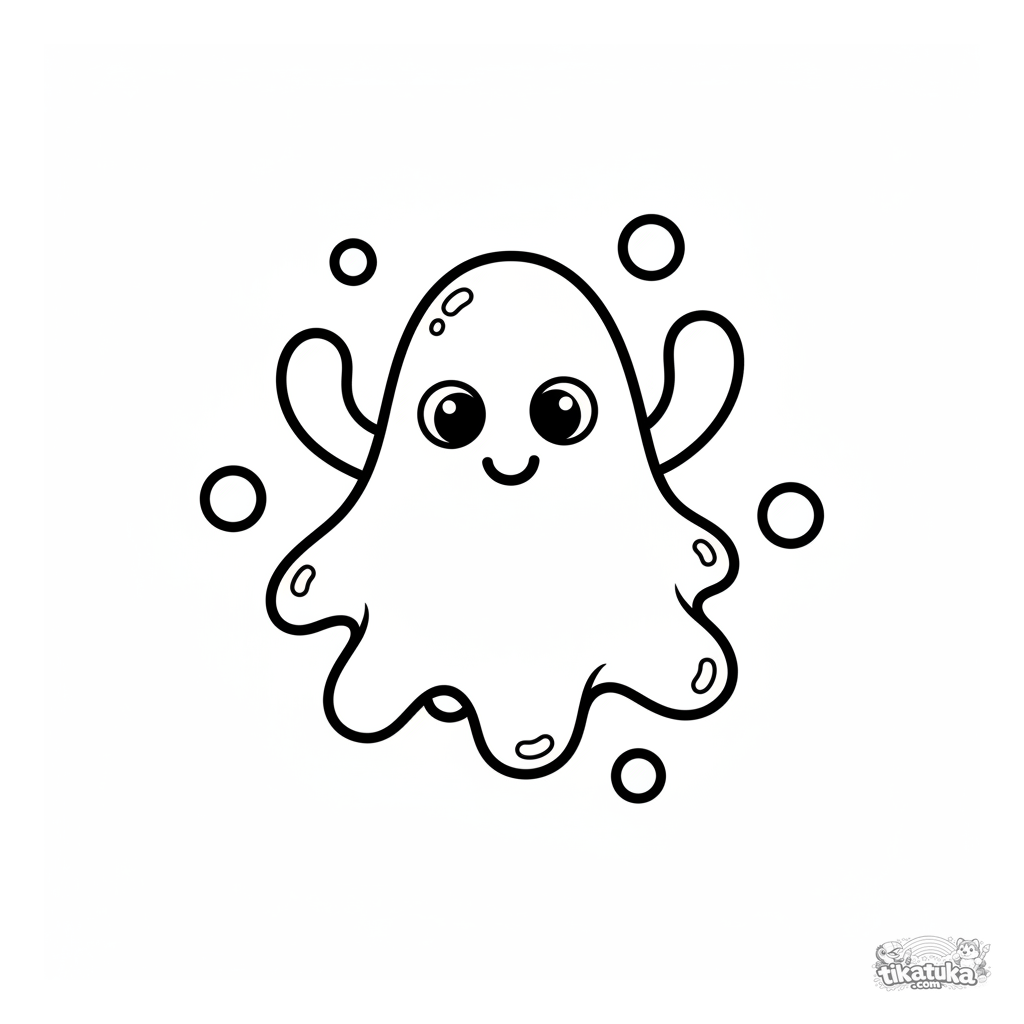 Раскраска для малышей 2-3 года: дружелюбная амёба с одним большим глазом и улыбкой машет своими ложноножками. Очень простая форма, толстые контуры.