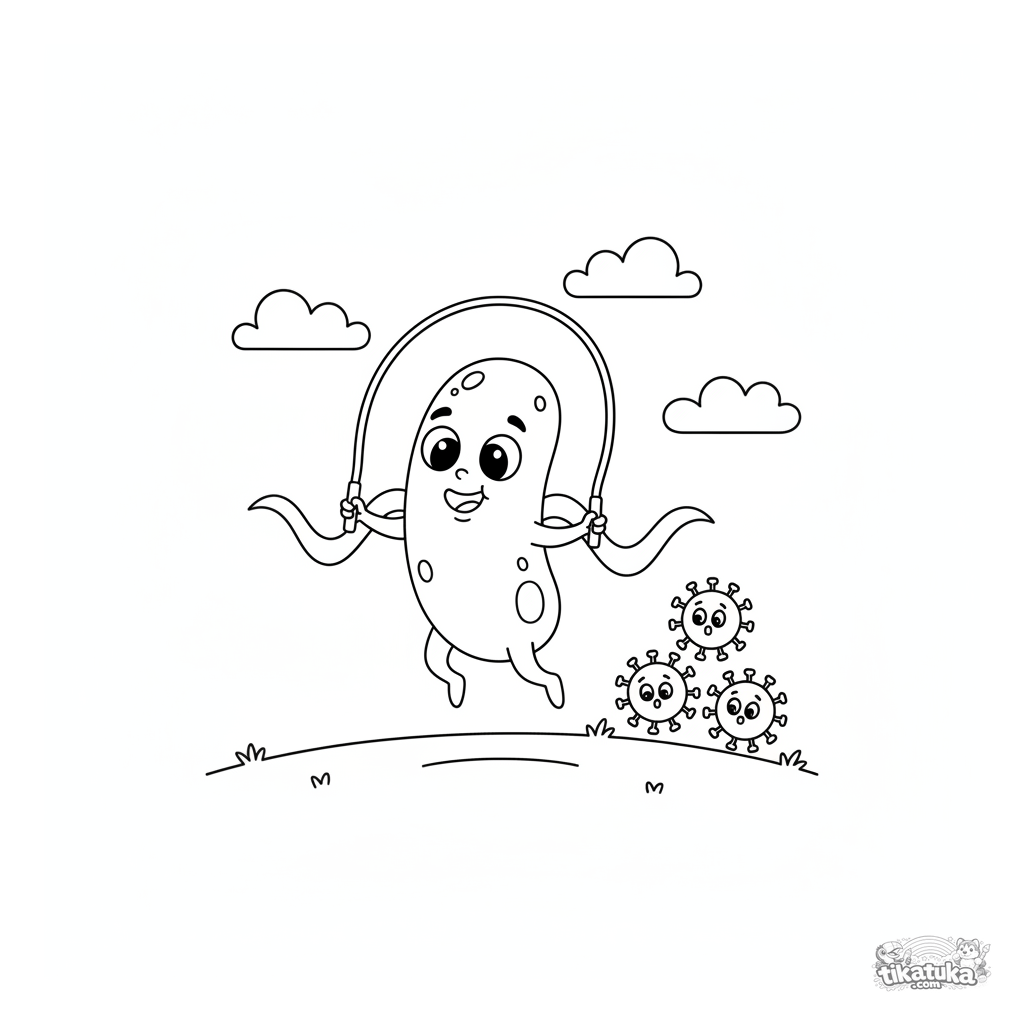 Раскраска с милой дружелюбной бактерией, которая играет со скакалкой, используя свои жгутики. Для детей 4-6 лет. Забавное и познавательное изображение микроба.