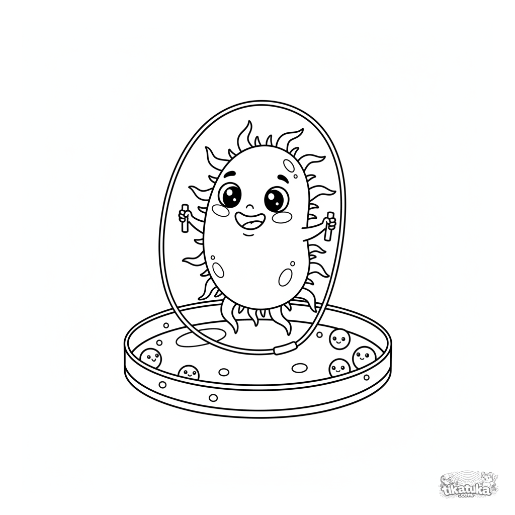 Раскраска про микробов для детей 4-6 лет: дружелюбная бактерия играет в скакалку внутри чашки Петри. Забавная и познавательная мультяшная сцена.