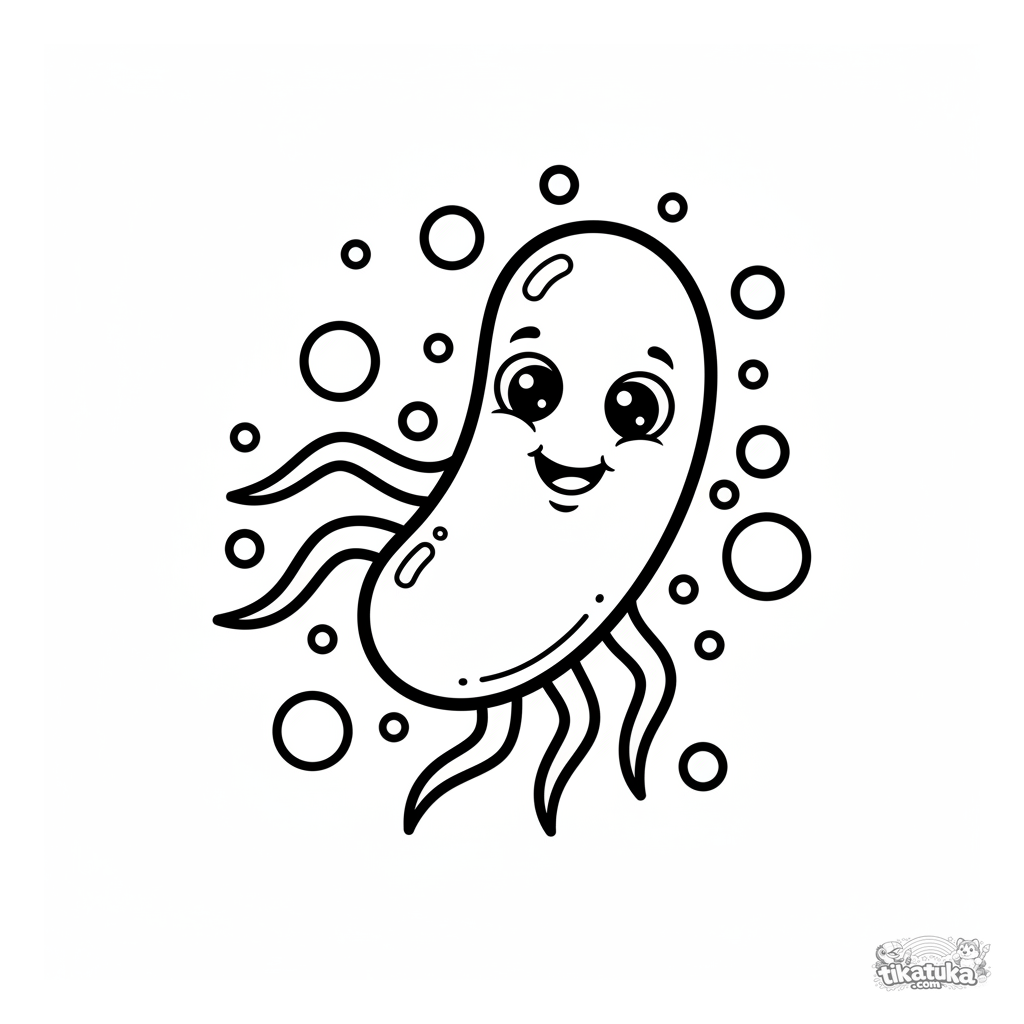 Простая раскраска для малышей 2-3 года: весёлая бактерия с улыбкой плывёт среди крошечных частичек. Крупные, чёткие контуры идеально подходят для первых карандашей.