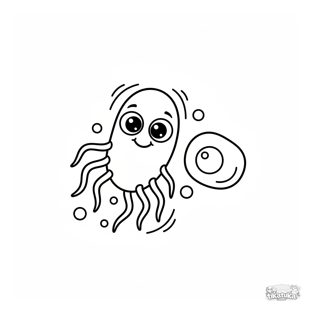 Простая раскраска для малышей 2-3 лет: дружелюбная мультяшная бактерия с большими глазами и усиками плывет. Огромные простые формы, широкие поля для закрашивания.