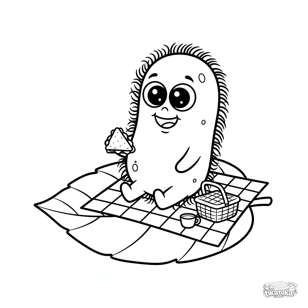 Раскраска с милой мультяшной бактерией, устроившей пикник на листе. Для малышей 2-5 лет. Простая и забавная сцена для первого раскрашивания.