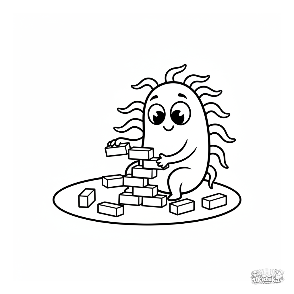 Простая и милая раскраска с дружелюбной бактерией, строящей башню из кубиков. Для малышей 2-5 лет. Забавное введение в мир микробов.