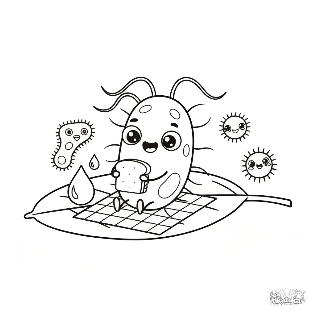 Простая и смешная раскраска с доброй бактерией, которая устроила пикник на листе. Для малышей 2-5 лет. Забавные глазки и простая форма.