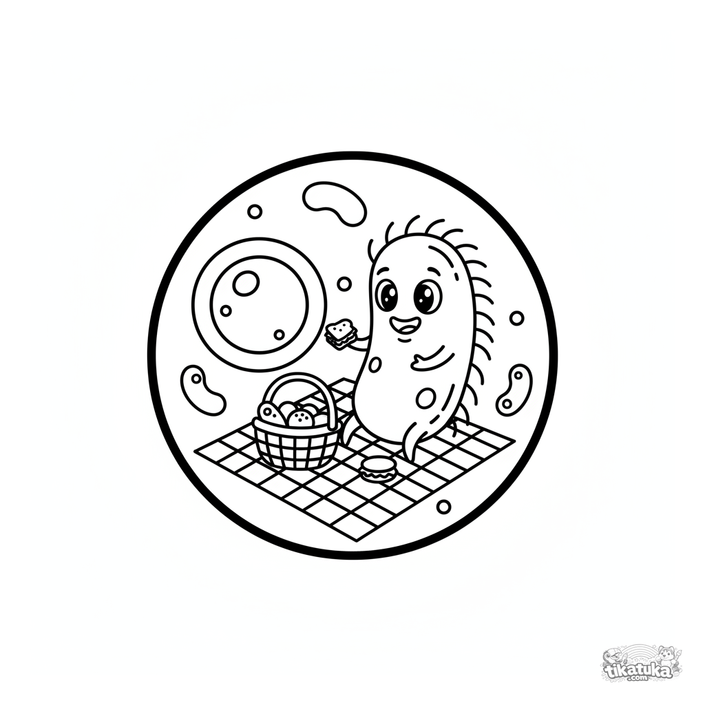 Забавная раскраска с милой бактерией, устроившей пикник на поверхности клетки. Для малышей 2-5 лет. Простые формы, дружелюбный персонаж.