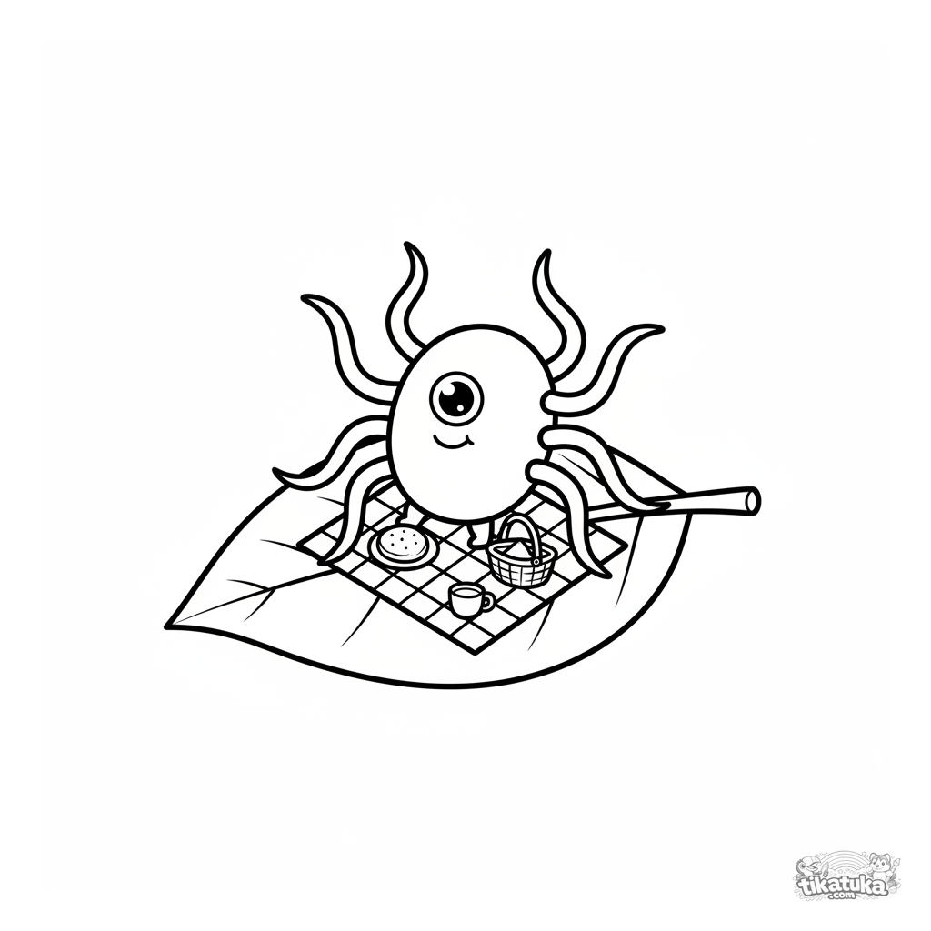 Раскраска с милой бактерией, которая устраивает пикник на листе с помощью своих жгутиков. Для малышей 2-5 лет. Забавная микроскопическая сцена.