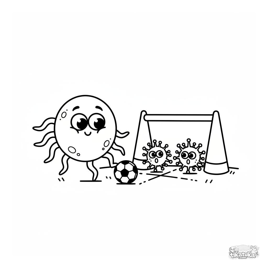 Простая раскраска для малышей: весёлая бактерия с усиками играет в футбол с вирусами. Для детей 2-5 лет. Крупные простые формы.