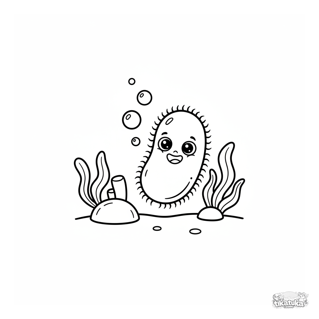 Раскраска для малышей 2-3 лет: милая мультяшная бактерия с большими глазками весело плавает рядом с коралловым рифом. Очень простые формы.