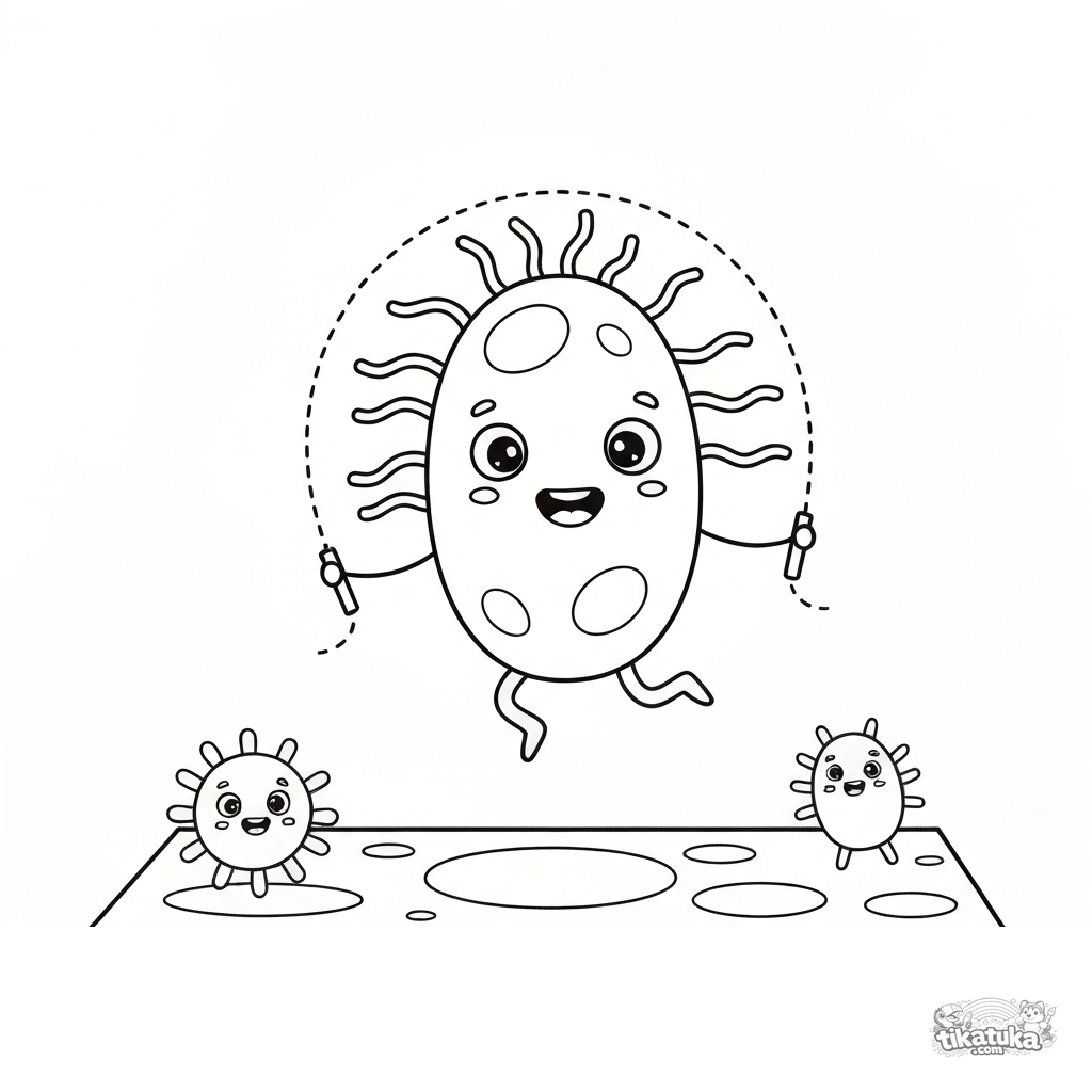 Забавная раскраска с дружелюбной мультяшной бактерией, которая прыгает через скакалку. Для малышей 2-5 лет. Очень простые и весёлые формы.