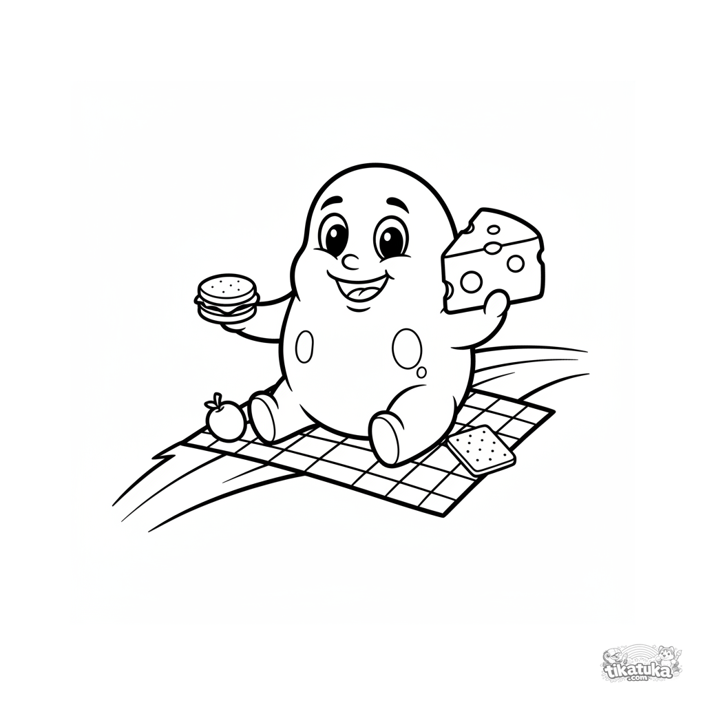 Простая раскраска для малышей 2-3 года: дружелюбная и пухлая лактобактерия устроила пикник на одеяле в траве, держа крошечный бутерброд и сыр.