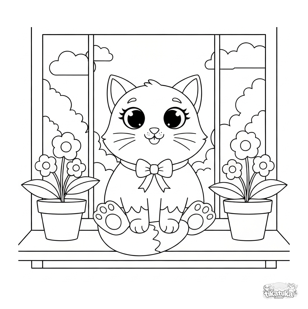 Милый пухлый котик с бантиком сидит на подоконнике между цветочными горшками. Скачайте, распечатайте или раскрасьте онлайн бесплатно!