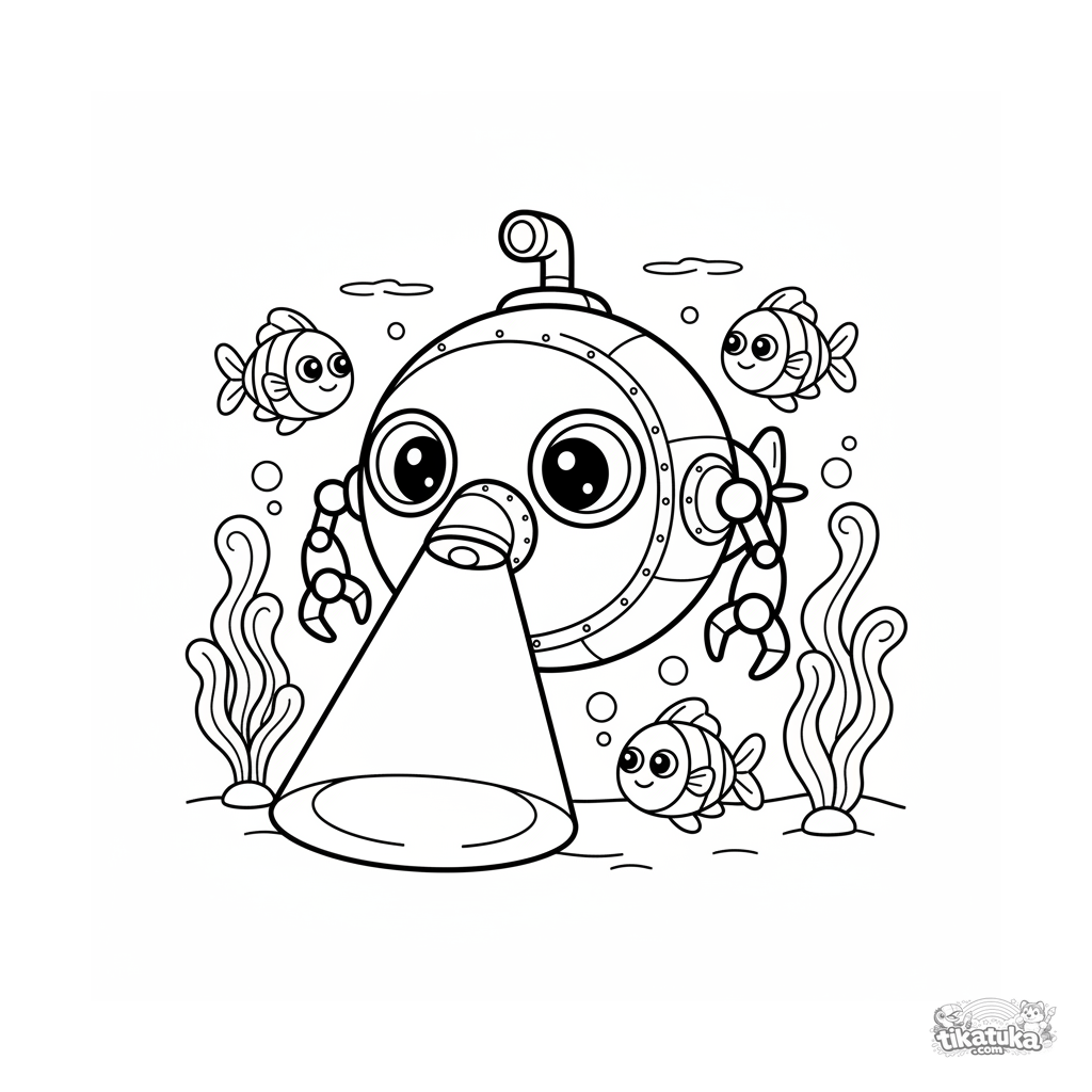 Очень простая раскраска для малышей 2-3 лет: милая круглая подводная лодка с глазками-иллюминаторами исследует морское дно. Крупные, дружелюбные формы.