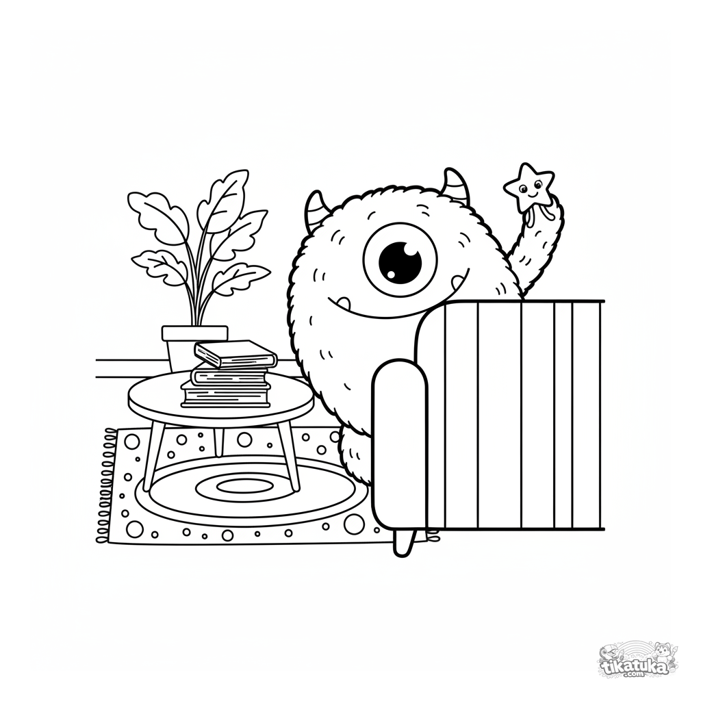 Раскраска для детей 4-6 лет: милый пушистый монстр с одним глазом выглядывает из-за дивана. Забавная сцена, сбалансированная детализация.