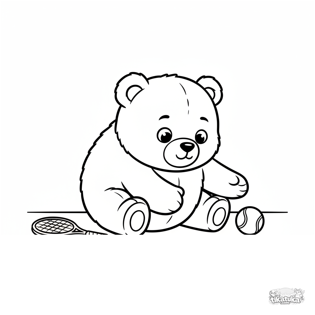 Простая раскраска для малышей 2-3 лет: плюшевый мишка на теннисном корте тянется за мячиком. Крупные формы, широкие поля.