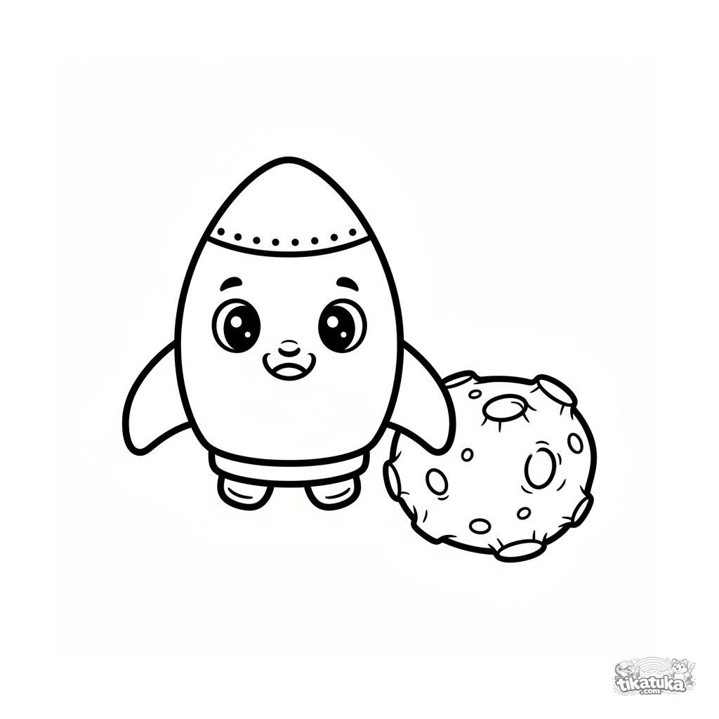 Раскраска для малышей 2-3 лет: милая ракета с глазками летает рядом с астероидом. Огромные простые формы, очень толстые контуры, идеально для маленьких ручек.