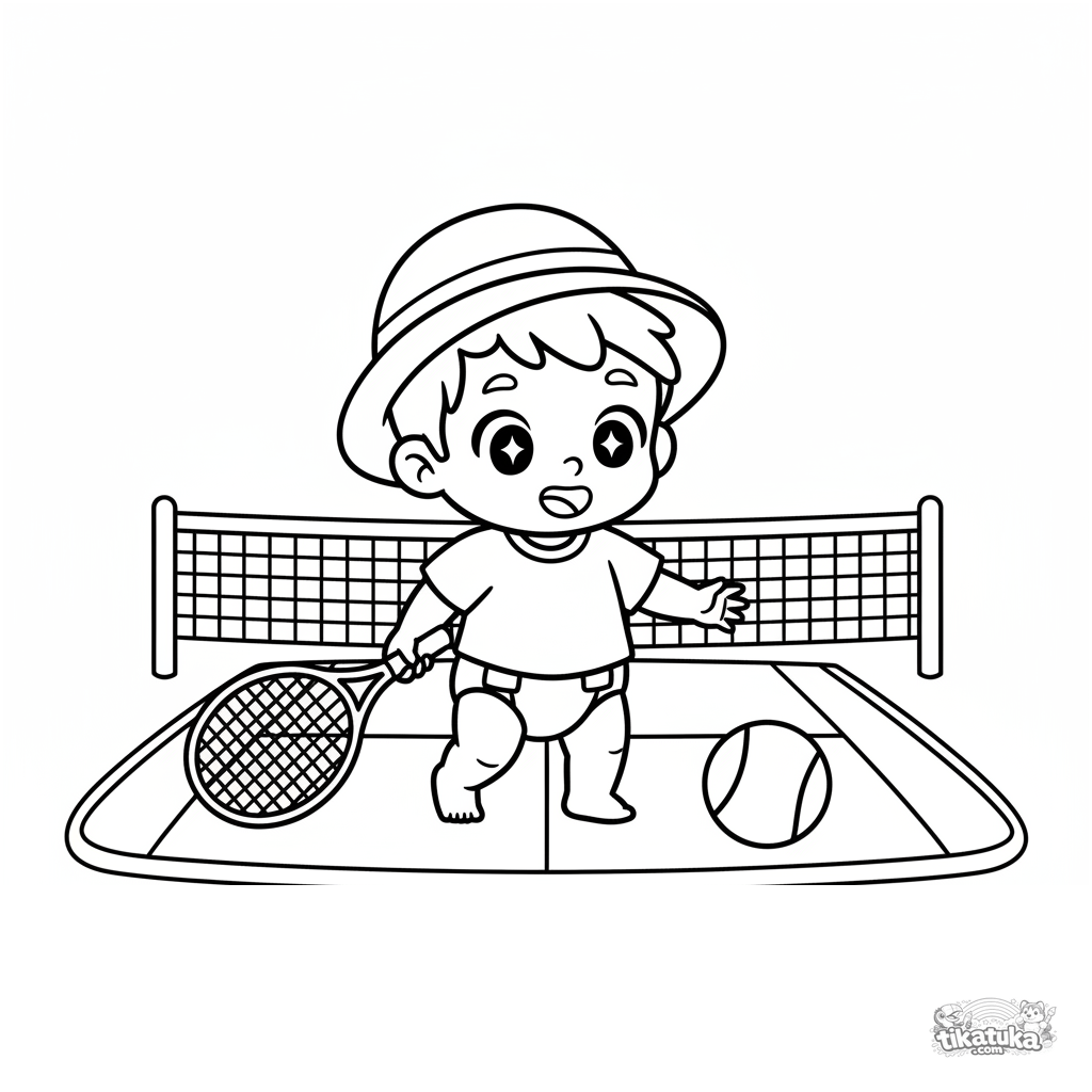 Раскраска для малышей 2-3 лет: ребенок с большой ракеткой бежит за мячом на теннисном корте. Простые крупные формы, идеально для первых карандашей.