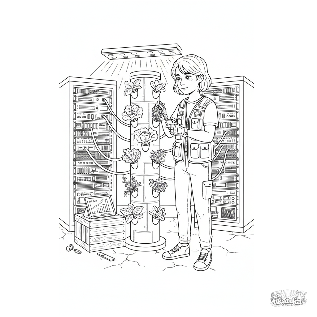 Раскраска для 10-12 лет: подросток-киберсадовод ухаживает за гидропонной установкой с зеленью, которая растёт среди серверных стоек в подвале. Детальная футуристическая сцена.