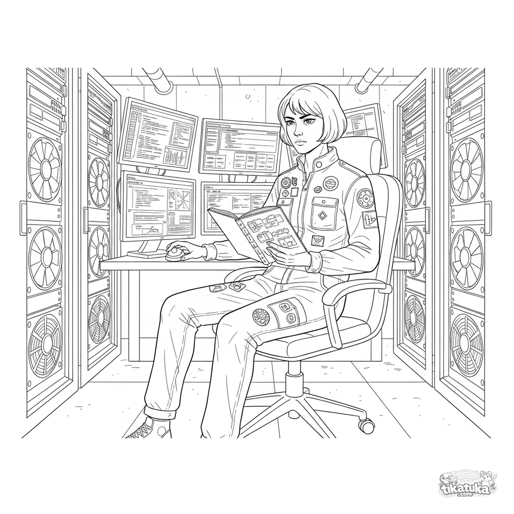 Раскраска для детей 10-12 лет: специалист по кибербезопасности работает в подвальной серверной. Детализированные стойки с серверами, множество мониторов, вентиляторы и схемы.