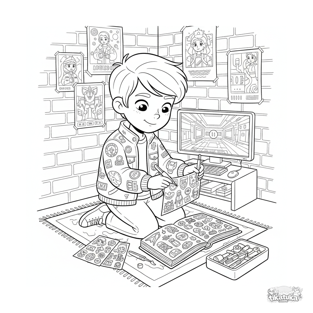 Раскраска: подросток-коллекционер наклеек в уютном подвале хакеров. Много деталей: плакаты, монитор, инструменты. Для детей 10-12 лет.