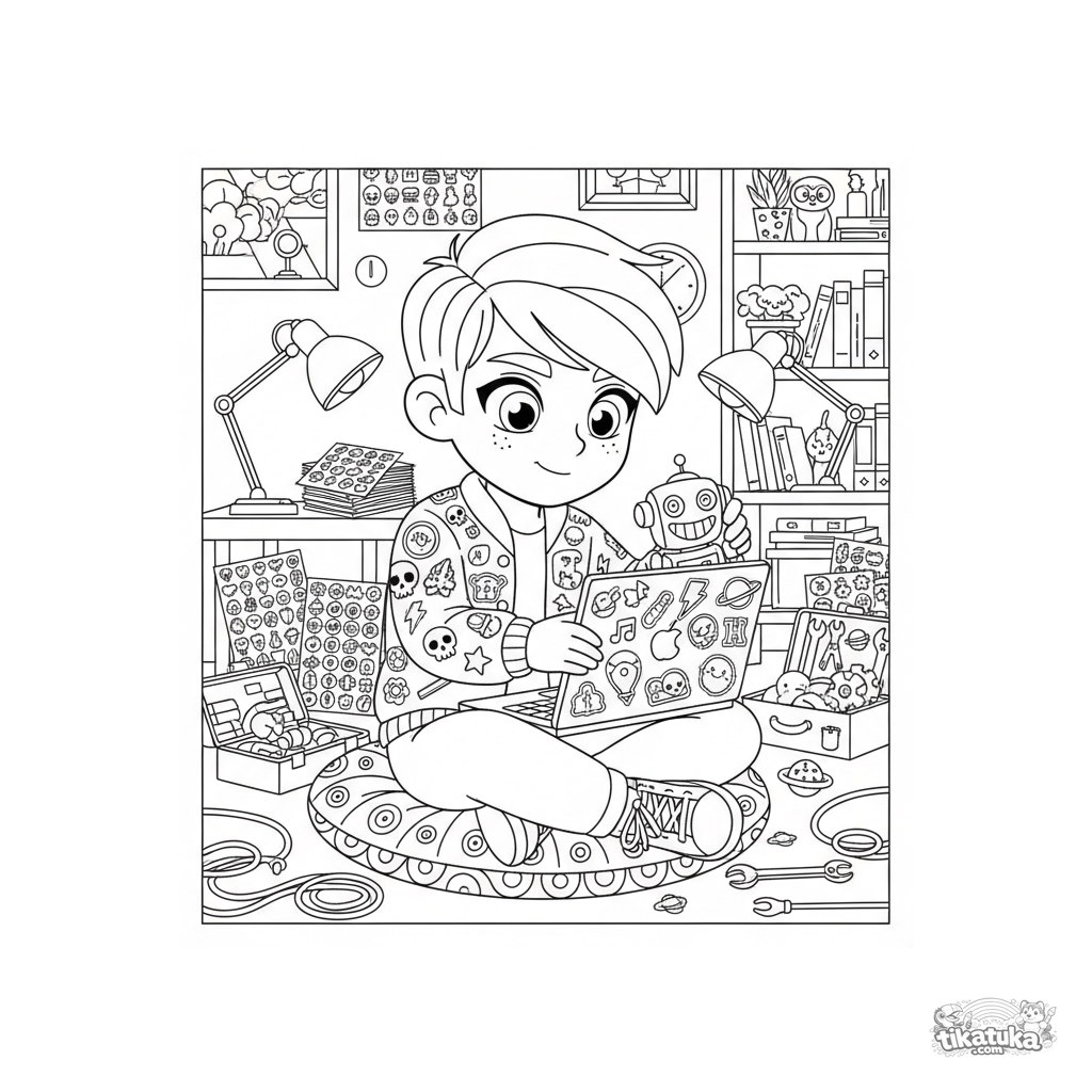 Раскраска: подросток-коллекционер стикеров в неоновом подвале. Много деталей: куртка с нашивками, ноутбук с деколями, инструменты. Для детей 10-12 лет.