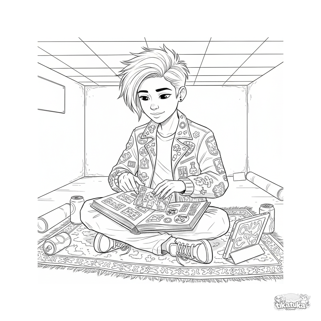 Раскраска для детей 10-12 лет: подросток в подвале сортирует коллекцию стикеров. Детализированная сцена с альбомами, планшетом и элементами андеграундного декора.