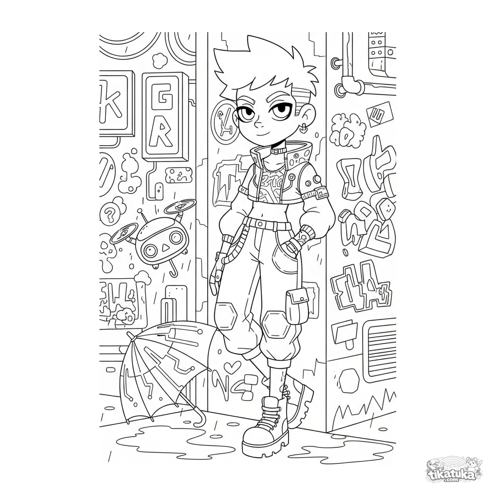 Раскраска для детей 10-12 лет: детализированный образ в стиле киберпанк уличной моды в неоновом переулке. С высокотехнологичными аксессуарами и городским фоном.