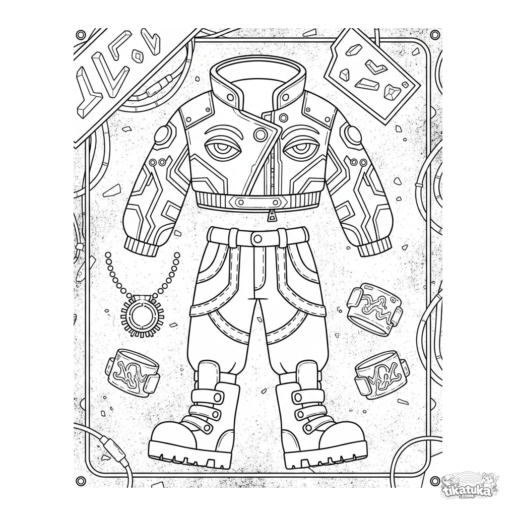 Сложная раскраска для возраста 10-12 лет: разложенный комплект одежды в стиле киберпанк с детализированными аксессуарами и технологичным фоном.