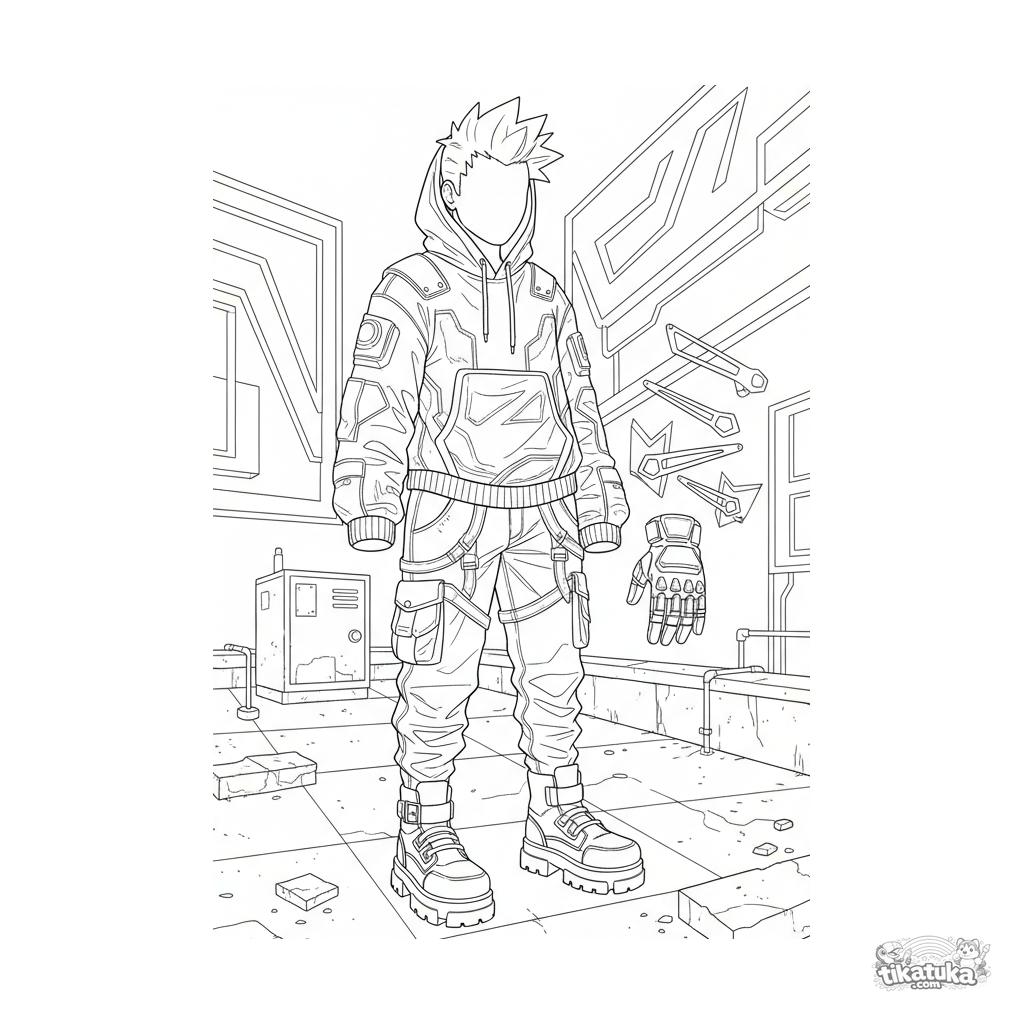 Сложная раскраска: киберпанк-аутфит в разложке на крыше. Для детей 10-12 лет, много деталей одежды и городского фона. Распечатать бесплатно.