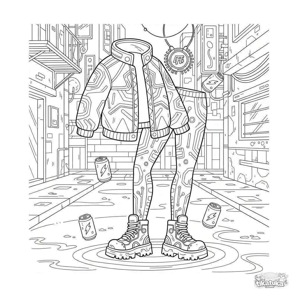 Сложная раскраска для девочек: уличный киберпанк-образ, разложенный в неоновом переулке. Холографическая куртка, технологичные аксессуары, детализированный городской фон.