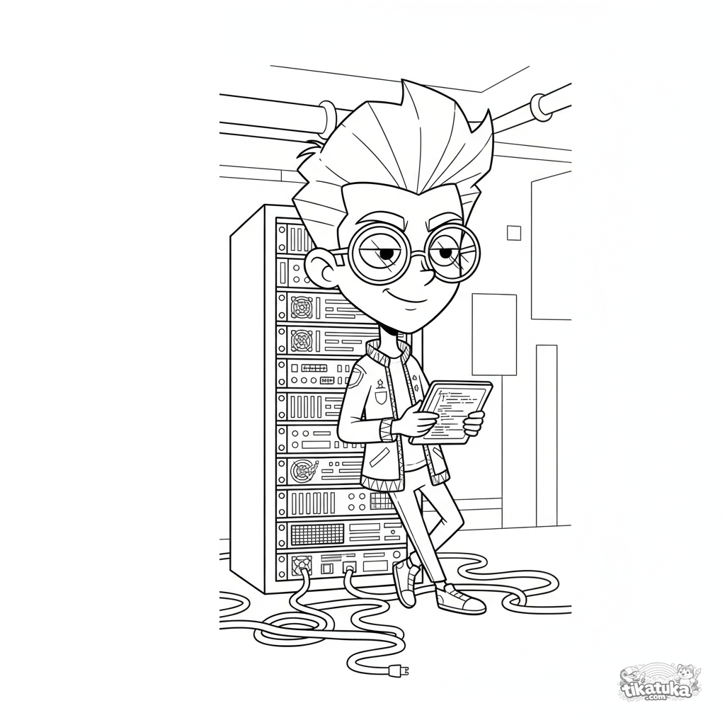 Раскраска в стиле киберпанк для детей 10-12 лет: программист у серверной стойки в подвале. Детали: неоновая отделка, провода, планшет с кодом, LED-подсветка.