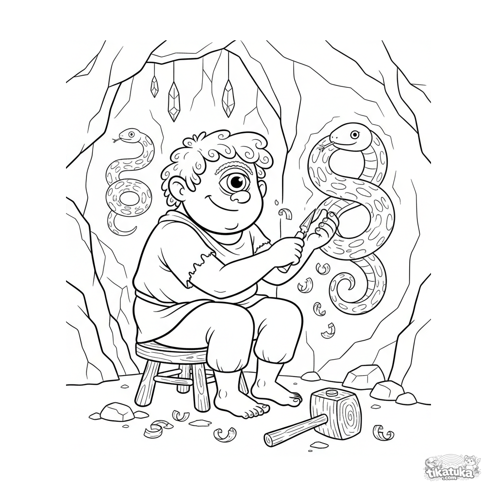 Раскраска для детей 4-6 лет: дружелюбный циклоп-ремесленник вырезает каменную змею на стене пещеры в логове Горгоны. Яркий народный стиль, простые формы, понятное действие.