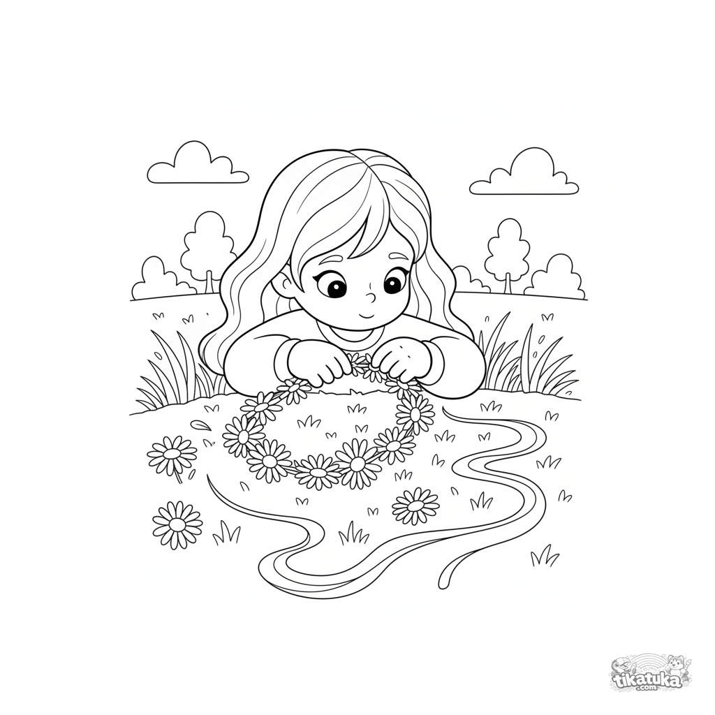 Раскраска для детей 4-6 лет: руки плетут венок из маргариток на лугу. Милая и спокойная сцена, развивающая моторику.