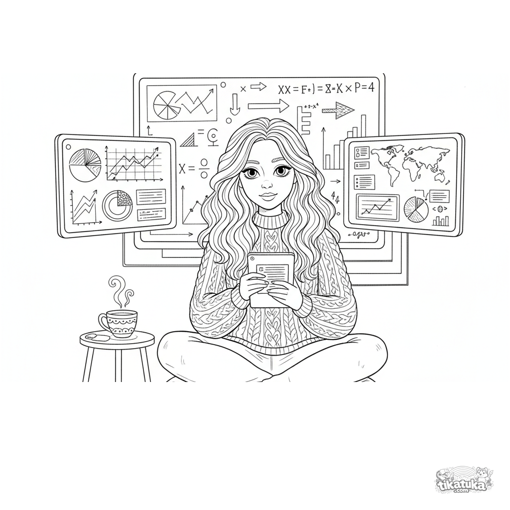 Раскраска для детей 10-12 лет: аналитик данных работает с многомониторной панелью в подвале. Детали: графики, карты, доска с формулами, чашка чая.