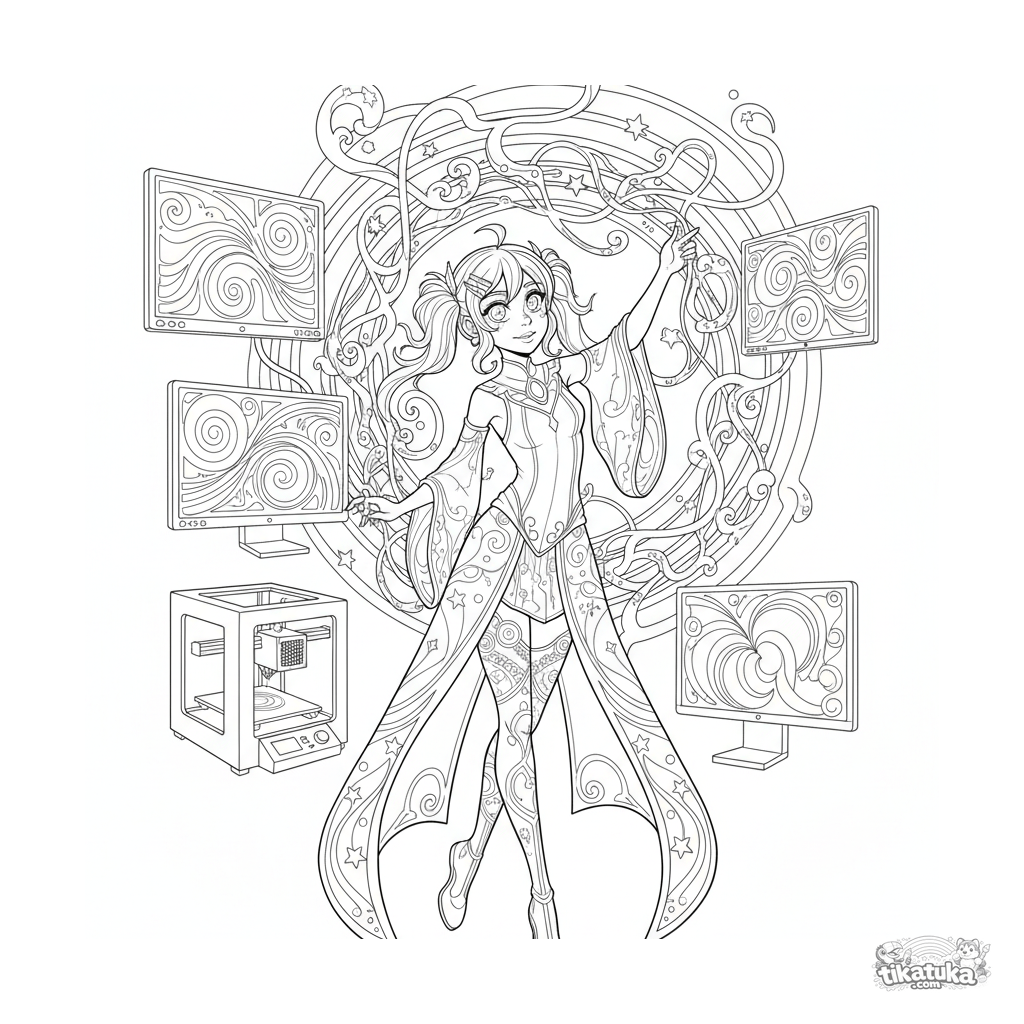 Раскраска для детей 10-12 лет: художник в подвале работает со светящейся скульптурой из данных. Детали: экраны с генеративным искусством, 3D-принтер. Стиль ар-нуво.