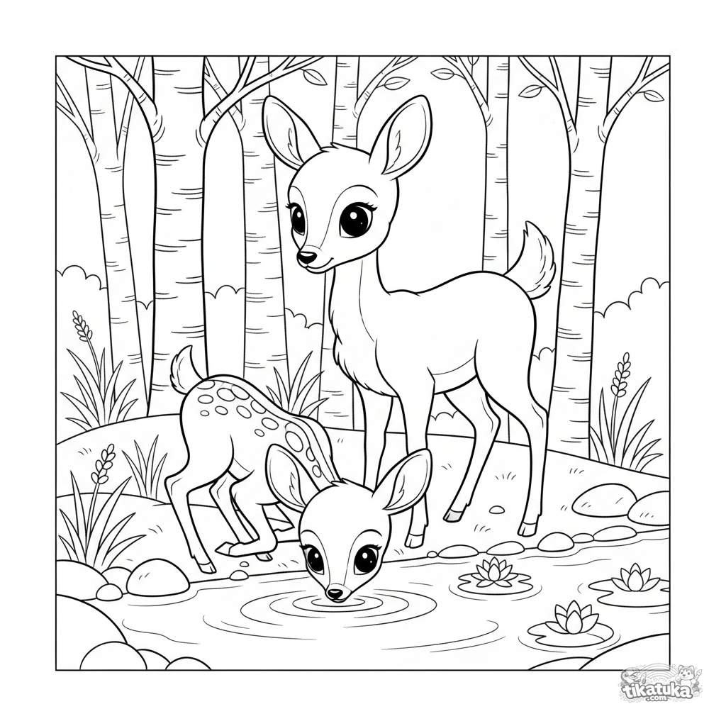 Раскраска для детей 7-9 лет в стиле акварельного скетча: пятнистый оленёнок пьёт воду из ручья, а его мать наблюдает за ним с опушки леса.
