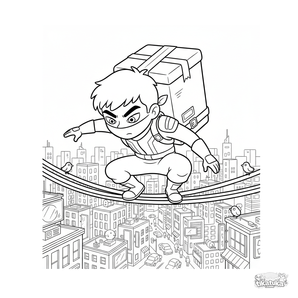 Крутая раскраска в стиле экшн-манги: нинзя-курьер балансирует на проводах над ночным мегаполисом. Сложный городской пейзаж для детей 10-12 лет.