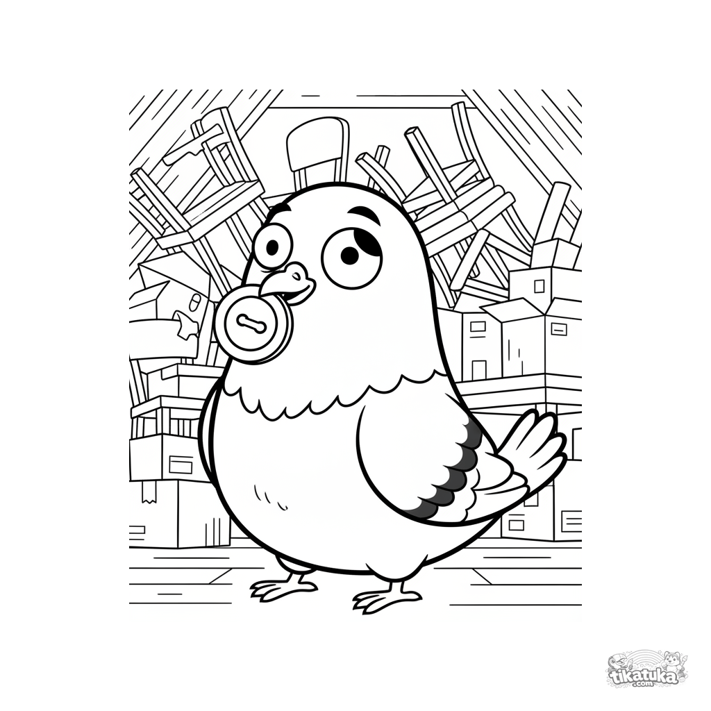 Растерянный голубь с большой кнопкой в клюве ищет выход из заваленного чердака. Скачайте, распечатайте или раскрасьте онлайн!
