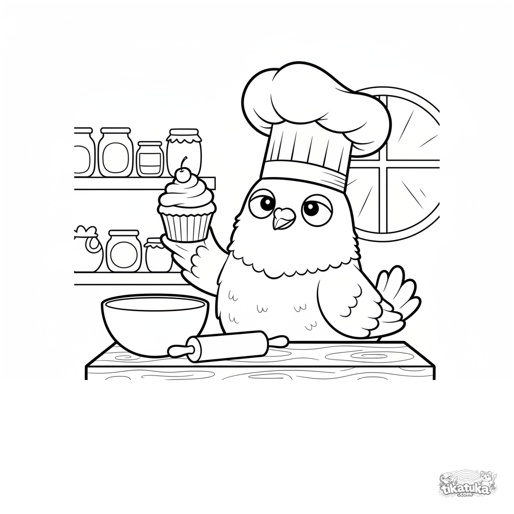 Раскраска с голубем-пекарем, который держит кекс. Для детей 4-6 лет. Милая птичка в колпаке за прилавком пекарни.
