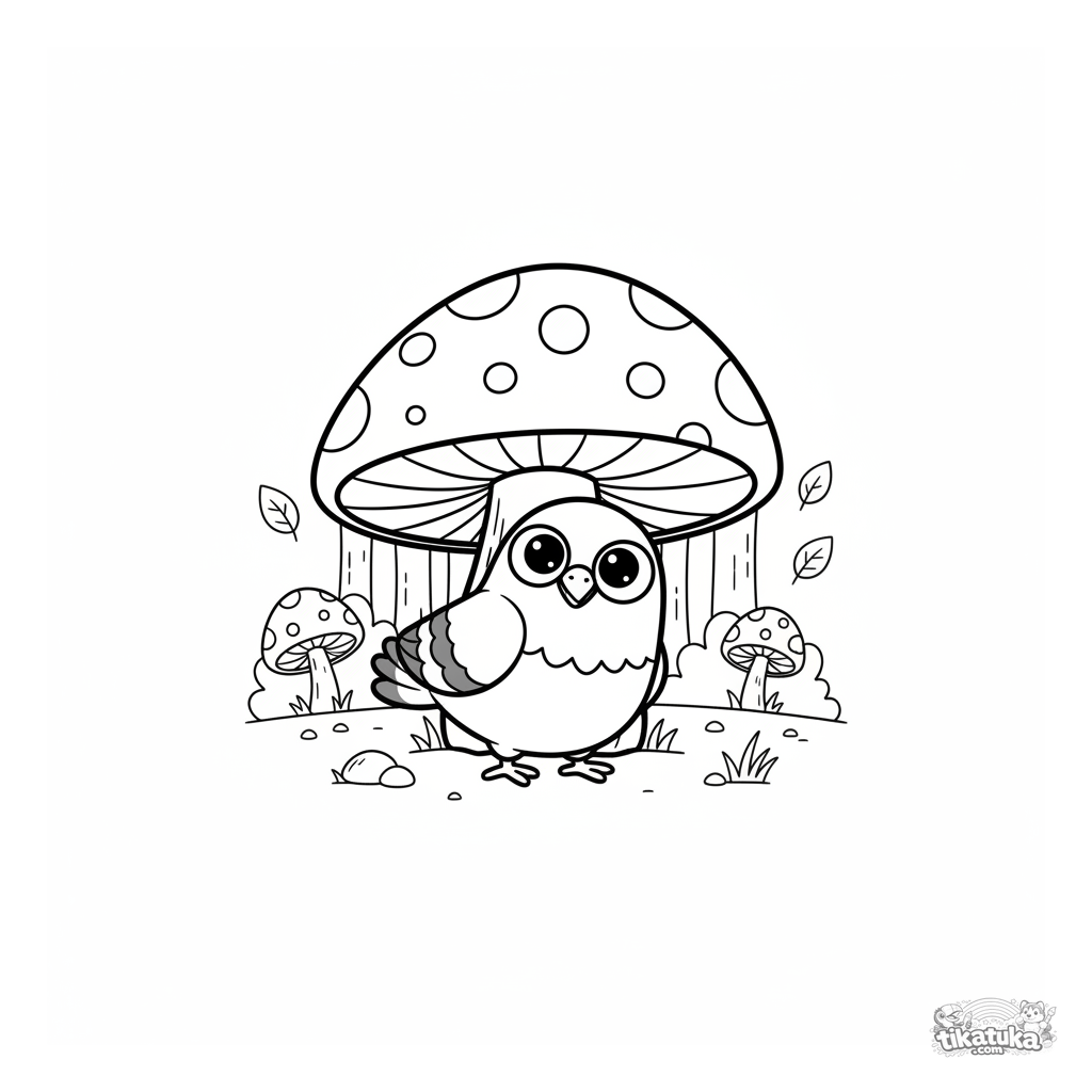 Раскраска с глупым голубем, играющим в прятки за большим грибом в лесу. Для детей 4-6 лет. Забавная лесная сцена, простые формы, милый персонаж.