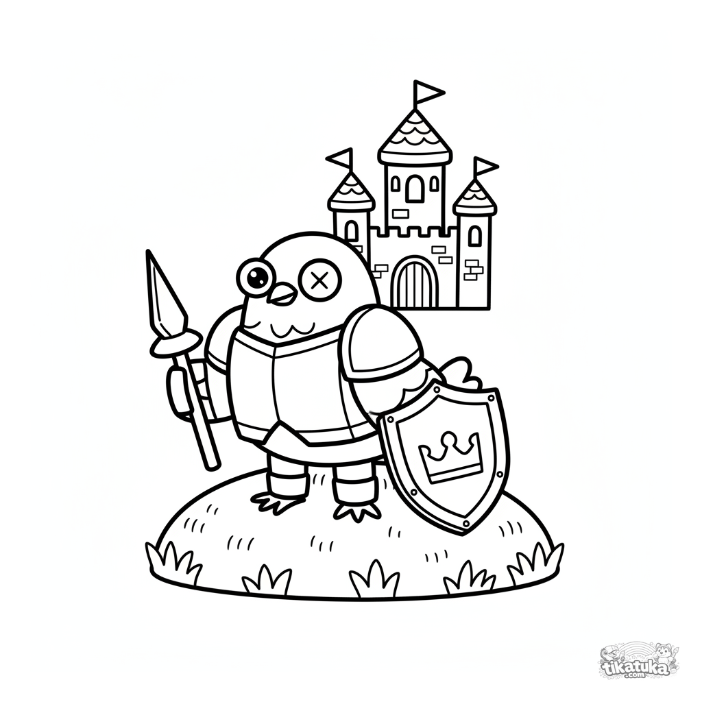 Раскраска для мальчиков: смешной голубь-рыцарь в игрушечных доспехах стоит у замка. Простые формы, широкие поля, для детей 4-8 лет.