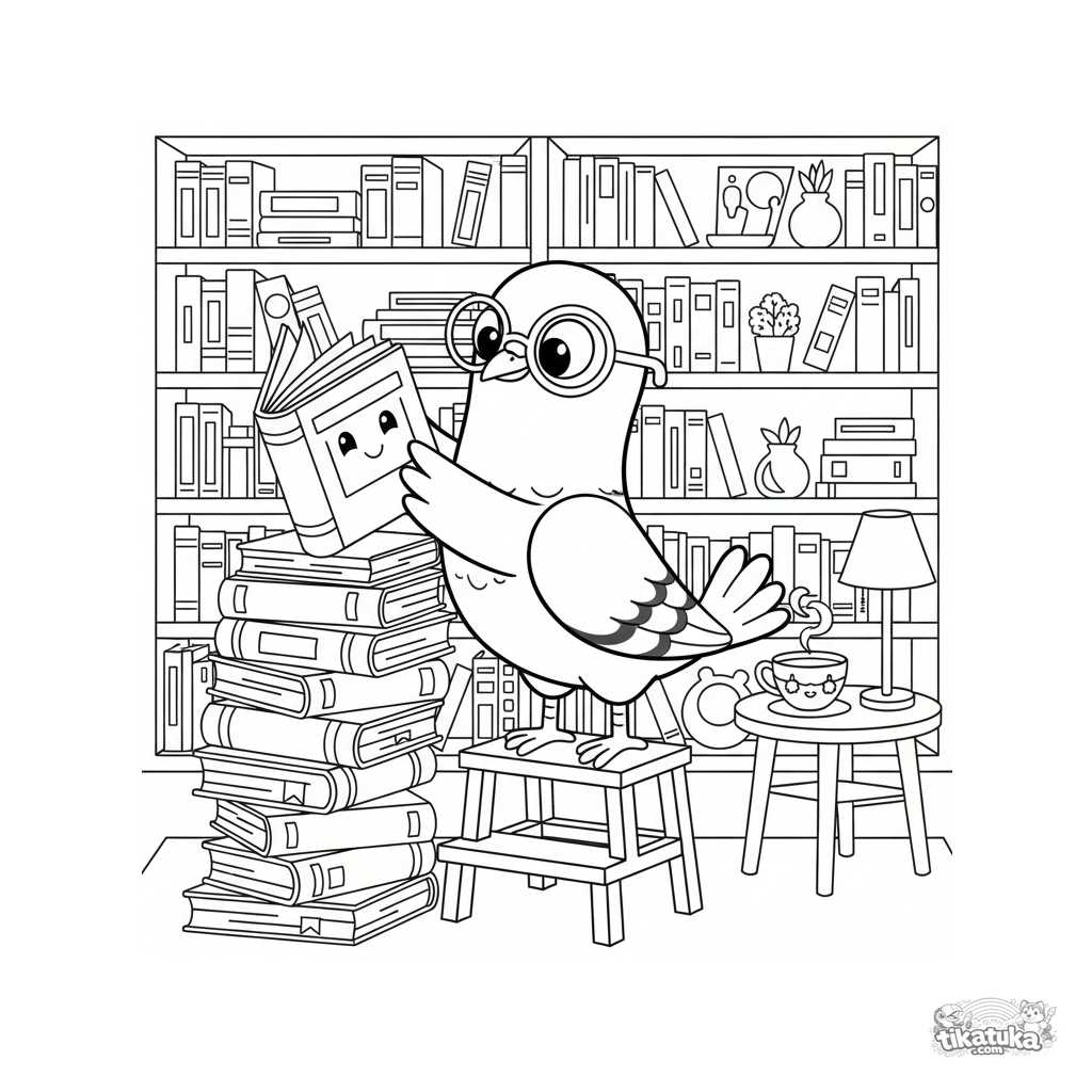 Раскраска для детей: голубь-библиотекарь в очках аккуратно ставит книгу на стопку. Уютная библиотечная атмосфера, широкие поля, для 4-8 лет.